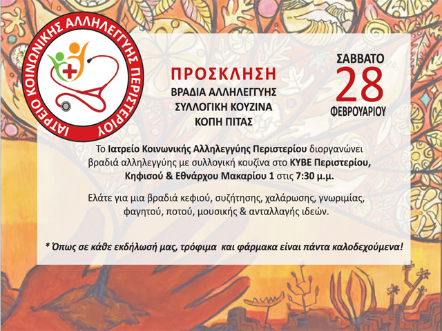 Tο ιατρείο Κοινωνικής Αλληλεγγύης Περιστερίου διοργανώνει βραδυά αλληλεγγυής με συλλογική κουζίνα.το Σάββατο 28 Φεβρουαρίου και ώρα 7.30 μ.μ στο ΚΥΒΕ Περιστερίου ,Κηφισού & Εθνάρχου Μακαρίου 1.