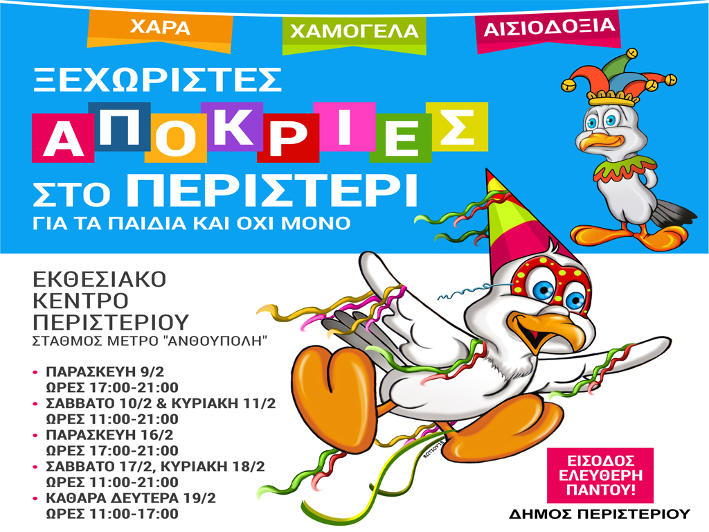 Ο Δήμος Περιστερίου διοργανώνει ξεχωριστές εκδηλώσεις και δραστηριότητες για να γιορτάσουμε και φέτος όλοι μαζί τις Απόκριες στον κλειστό χώρο του Εκθεσιακού Κέντρου Περιστερίου (Δωδεκανήσου & Αναπαύσεως – Στάση Μετρό «Ανθούπολη»).