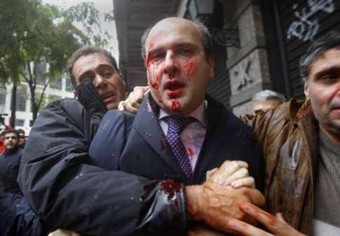 «Κλέφτες, κλέφτες! Ντροπή σας!» φώναζαν οι διαδηλωτές κατά του πρώην υπουργού, χτυπώντας τον με πέτρες και ξύλα.