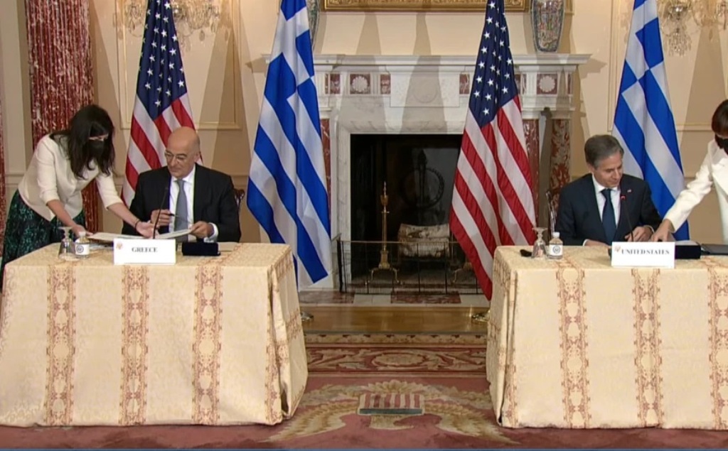 Η επιβεβαίωση του στρατηγικού και σταθεροποιητικού ρόλου που διαδραματίζει η Ελλάδα από την περιοχή των Βαλκανίων μέχρι την Ανατολική Μεσόγειο βρίσκεται στον πυρήνα της νέας Συμφωνίας Αμοιβαίας Αμυντικής Συνεργασίας (MDCA) που υπέγραψε η χώρα μας με τις ΗΠΑ. Λίγο μετά την ολοκλήρωση της συνάντησης του Νίκου Δένδια με τον Άντονι Μπλίνκεν στο Στέιτ Ντιπάρτμεντ, οι δύο υπουργοί προσήλθαν στην αίθουσα Benjamin Franklin όπου υπέγραψαν σε ειδική τελετή την πενταετή ανανέωση της συμφωνίας.