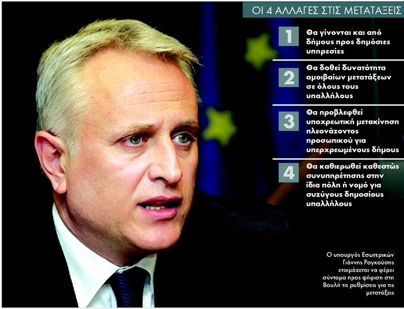 Πράσινο φως για τις µετατάξεις από δήµους µε πλεονάζον προσωπικό δίνει τροπολογία, που καταθέτει σήµερα ο υπουργός Εσωτερικών Γιάννης Ραγκούσης στη Βουλή.