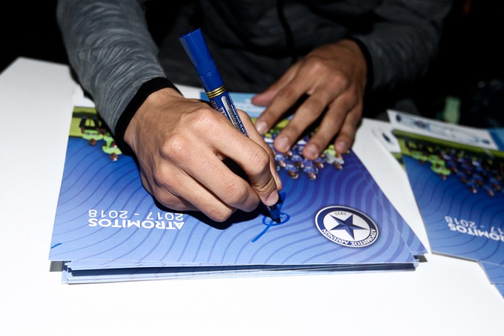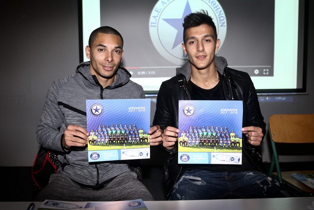Οι ποδοσφαιριστές Νικολά Ντιγκινί και Δημήτρης Γιαννούλης ήταν οι σημερινοί εκπρόσωποι της ομάδας στην Αγία Βαρβάρα, οι οποίοι συνομίλησαν αρκετή ώρα με τα παιδιά και υπέγραψαν δεκάδες αυτόγραφα για τους μικρούς υποστηρικτές του Ατρομήτου.