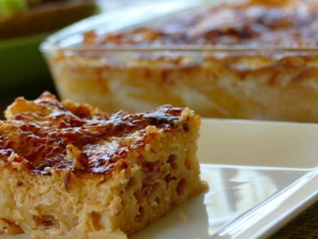 Σε ένα μπολ χτυπάμε με το σύρμα τα αυγά με τον πελτέ και τη σάλτσα πιπεριάς. Αλατοπιπερώνουμε και τα προσθέτουμε κι αυτά στο πυρίμαχο σκεύος. Ανακατεύουμε καλά. Σκορπάμε από πάνω το βούτυρο κομμένο σε κομματάκια και ψήνουμε σε προθερμασμένο, στους 180 βαθμούς, φούρνο για 50′-60′ μέχρι να απορροφήσουν τα ζυμαρικά τα υγρά τους.